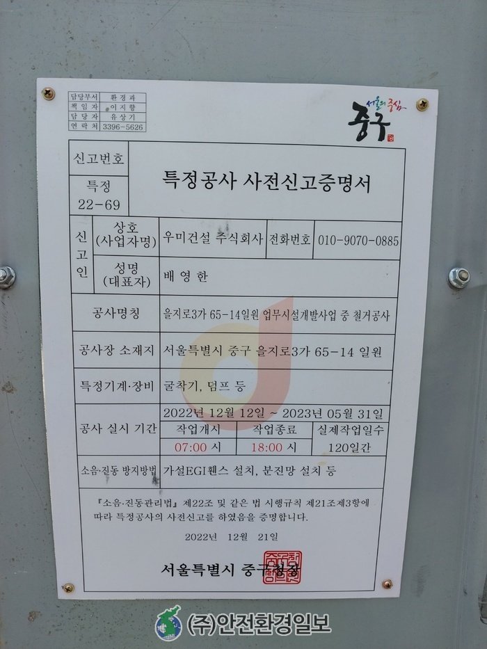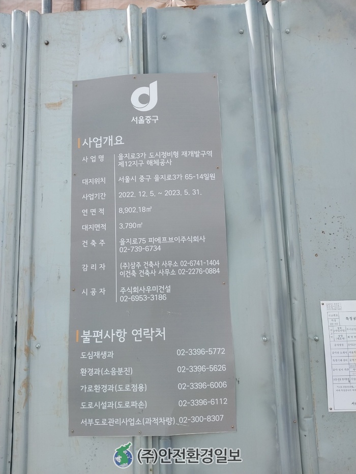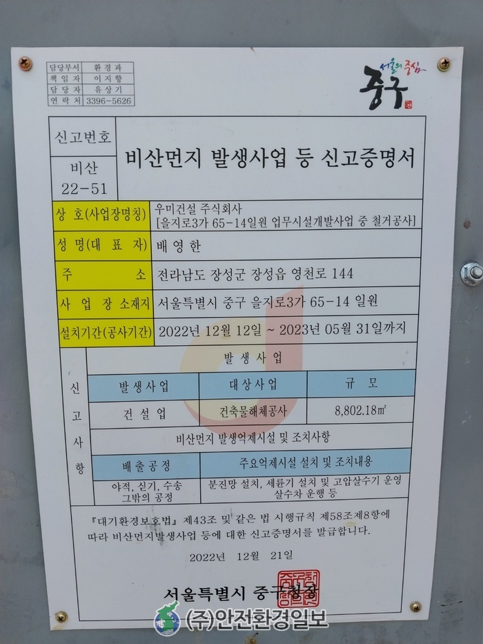 (주)우미건설에서 시공하고 있는 서울 중구 을지로3가 65-14번지 일원 내 특정공사 현장의 허가표지판은 2022년 12월 12일에서 2023년 5월 31일까지 약 120일간 공사 기간으로 신고되어있는데, 사진 자료에 근거한 철거현장 모습이 무법천지 엉망이다.