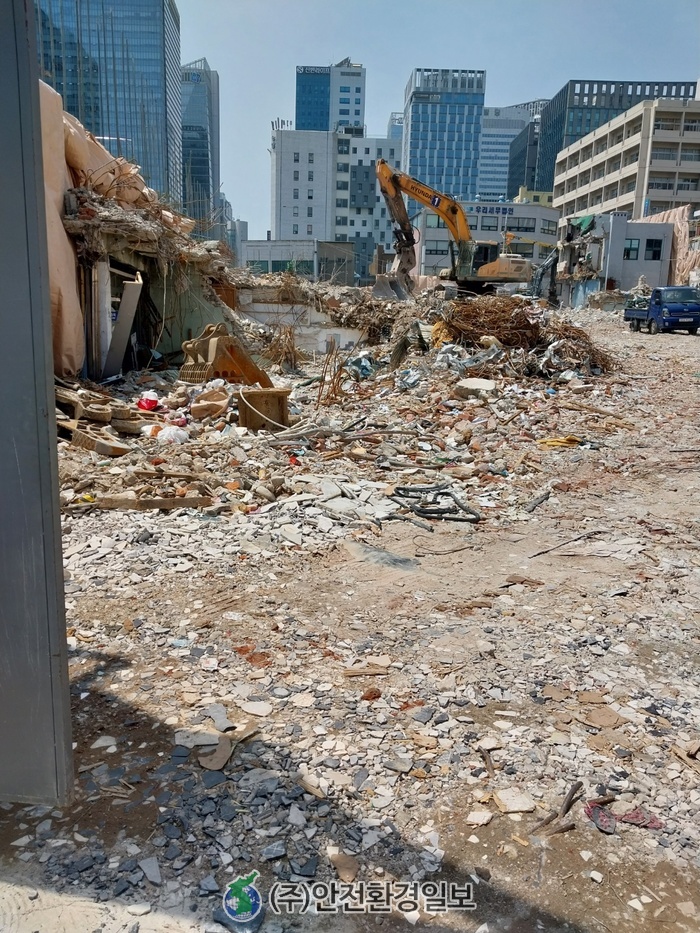 3. 철거 후 발생한 건설폐기물 야적 상태를 보아 담당 자치단체 공무원이 공사 진행을 독촉하기 위해서 불법을 자행하는 것을 눈감아 준 것으로 추정되어 환경운동가로서 너무나 허탈한 심정이다. 서울 도심 한복판 불특정 다수에게 위해를 가할 수 있는 특급발암물질이 폐콘크리트에 덮여있는 노란 스펀지 형태인 단열재(유리섬유 또는 폐보드류)는 처리기준이 아주 까다로워 고온 용융소각 또는 관리형 매립장에서 높은 비용을 요구해 분리·선별하지 않고 마구잡이식 건설기계 장비로 찍어 내리기 때문에 건설폐기물 처리장에서도 비용이 천정부지로 오르고 있어 결국 건축비용에 포함되어 소비자 몫인 아파트 매입자가 고단가로 피해를 볼 수밖에 없는 실정이다. 따라서 도시정비형 재개발구역에 대한 환경비용을 적합하게 설계에 반영해야 이런 불법 형태가 반복되지 않는다고 볼 때, 발주처의 책임이 크다고 할 것입니다.